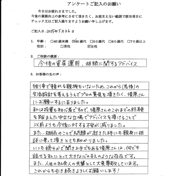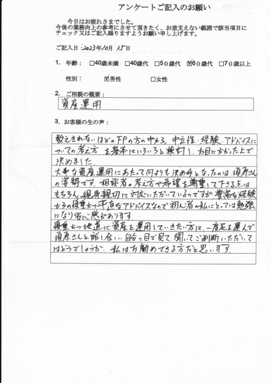 証券会社・証券リサーチ会社での30年以上にわたる証券業務経験およびNPO法人で遺言作成に携わっている経験をお客様のためにお役に立てたいとの思いが私のFP活動の原点です。
